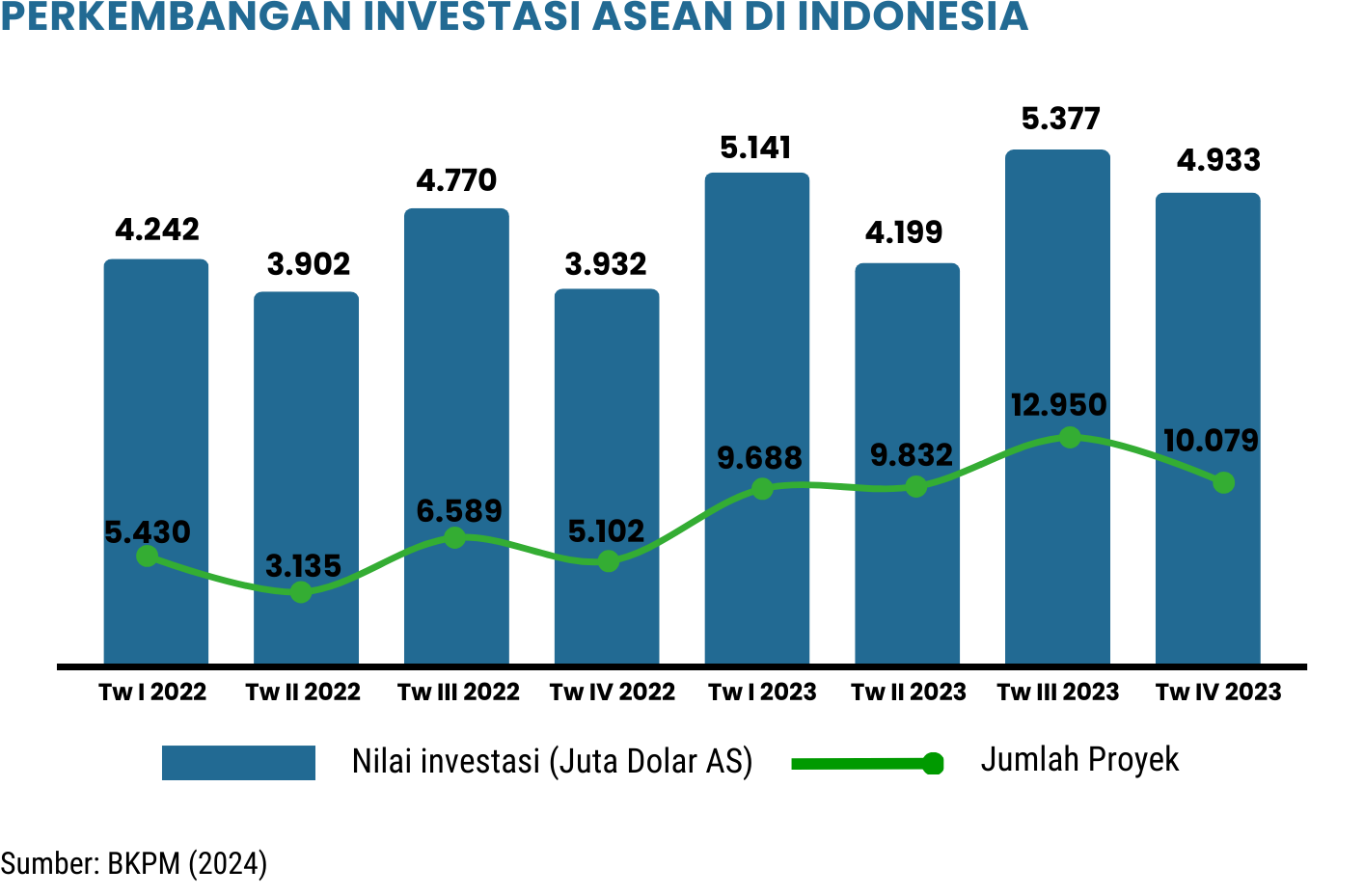 Perkembangan investasi dari negara-negara ASEAN mengalami penurunan pada saat pandemi di tahun 2019-2020. Namun seiring dengan membaiknya kondisi pandemi, terjadi peningkatan nilai investasi di Indonesia. Data Badan Koordinasi Penanaman Modal (BKPM), nilai investasi asing (Foreign Direct Investment/FDI) menunjukkan bahwa pada tahun 2022 nilai investasi negara ASEAN ke Indonesia senilai 16,8 miliar dolar AS dengan jumlah proyek 20.256. Sementara itu pada Triwulan III 2023 nilai proyek 5,3 miliar dolar AS dengan jumlah proyek 12.950. Nilai ini meningkat dibanding periode yang sama di tahun sebelumnya di mana pada Triwulan III 2022 senilai 4,77 miliar dolar AS dengan jumlah proyek 6.589 sebagaimana ditunjukkan oleh grafik berikut.