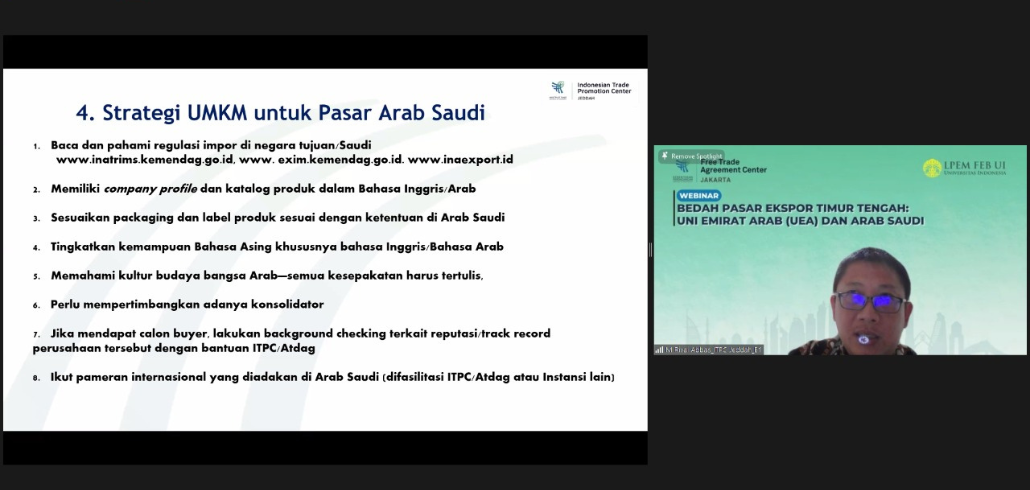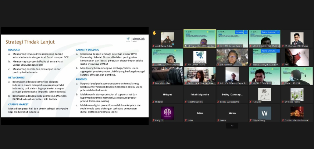 Setelah itu, pemaparan dilanjutkan oleh Kepala ITPC Jeddah, Bapak Muhammad Rivai Abbas. Pada awal pemaparan, disampaikan overview secara umum kawasan Timur Tengah dan peluang ekspor. Khusus pasar Saudi Arabia, produk andalan pada tahun 2021 diantaranya kendaraan USD 599 juta, minyak goreng USD 279 juta, dan kayu arang dan plywood USD 102 juta.