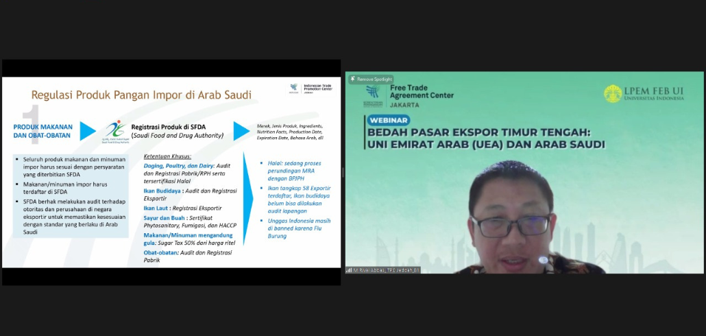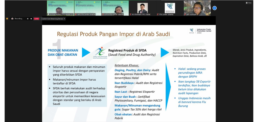 Diinformasikan oleh Kepala ITPC Jeddah, secara global posisi ekspor Indonesia ke Arab Saudi berada di posisi ke-16. Sementara dalam lingkup ASEAN Indonesia berada di posisi kedua setelah Thailand dengan pangsa pasar 25%. Selain itu, informasi lainnya mengenai potensi ekspor produk Indonesia ke Arab Saudi, posisi Indonesia dalam Global Halal Food (2020) dan muslim fashion (2020). Sementara untuk regulasi produk pangan impor di Arab Saudi harus terdaftar di Saudi Food and Drug Authority (SFDA), registrasi produk di Saudi Standards, Metrology and Quality Organization Register (SASO), dan registrasi lainnya (tidak wajib) berupa pendaftaran merek dagang ke Kementerian Perdagangan Arab Saudi.