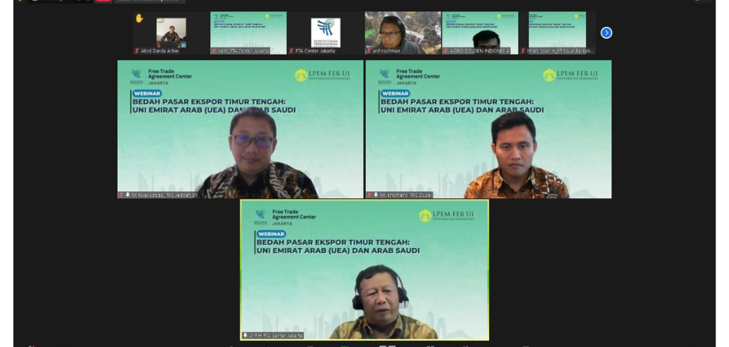 #kawaniaga pada 1 Desember 2022, FTA Center Jakarta telah melaksanakan kegiatan daring dengan tema “Bedah Pasar Ekspor Timur Tengah: Uni Emirat Arab (UEA) dan Arab Saudi”, yang menghadirkan narasumber Kepala International Trade Promotion Center (ITPC) Dubai, Bapak Muhammad Khomaini, dan Bapak Muhammad Rivai Abbas, Kepala ITPC Jeddah.
