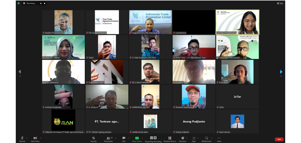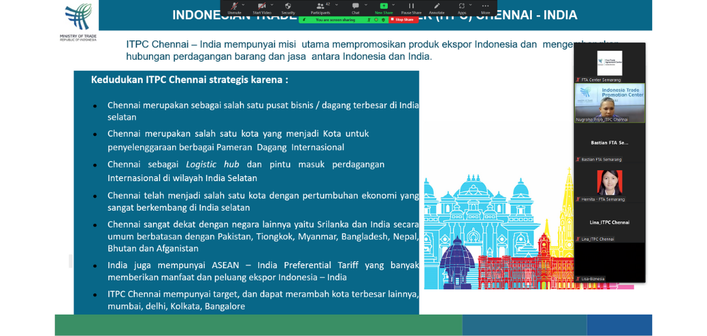 #kawaniaga FTA Center Semarang menyelenggarakan kegiatan webinar dengan tema "Bedah Pasar Komoditas Spices (Rempah-rempah) Jawa Tengah di Pasar India" pada tanggal 22 Mei 2023 dengan narasumber Kepala ITPC India yang menyampaikan terkait peluang dan tantangan produk rempah-rempah pasar ekspor India. Kegiatan tersebut di moderatori oleh Tenaga Ahli FTA Center Semarang yakni Bapak Bastian Turidobroto yang diikuti oleh 32 peserta pelaku usaha binaan FTA Center Semarang dengan produk rempah-rempah.