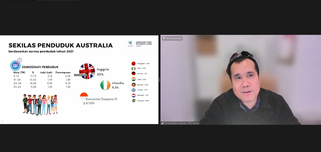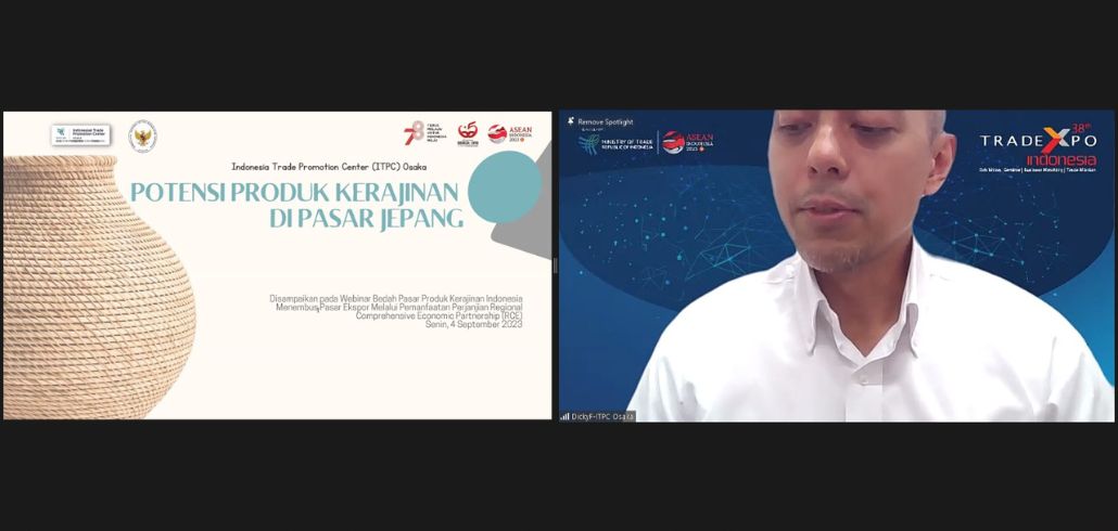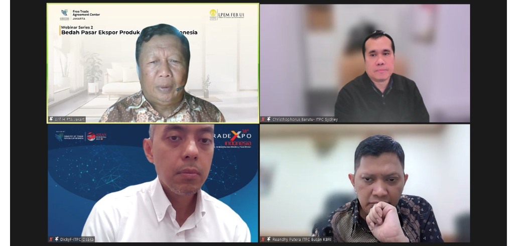 Webinar yang dilaksanakan pada tanggal 23 Agustus 2023 mengundang narasumber Bapak Christhophorus Barutu selaku Kepala ITPC Sydney dan Bapak Dicky Farabi selaku Kepala ITPC Osaka.