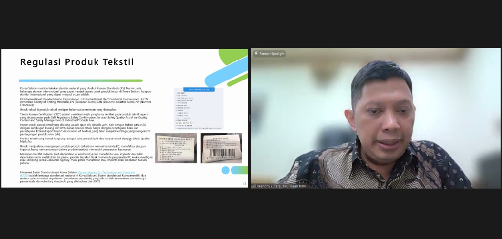 Pemaparan ketiga dari Kepala ITPC Busan-Bapak Reandhy Putera Dharmawan menjelaskan mengenai perkembangan ekspor non migas Korea Selatan, produk industri potensial ekspor Indonesia ke Korea Selatan, tips memasuki pasar Korea Selatan dengan produk kerajinan, serta pembahasan lebih rinci mengenai produk kerajinan kayu, keramik atau kaca, anyaman rotan, lilin aroma terapi, bati modifiasi dan kain tenun. Kepala ITPC Busan juga menjelasan mengenai regulasi produk tekstil dan kayu.