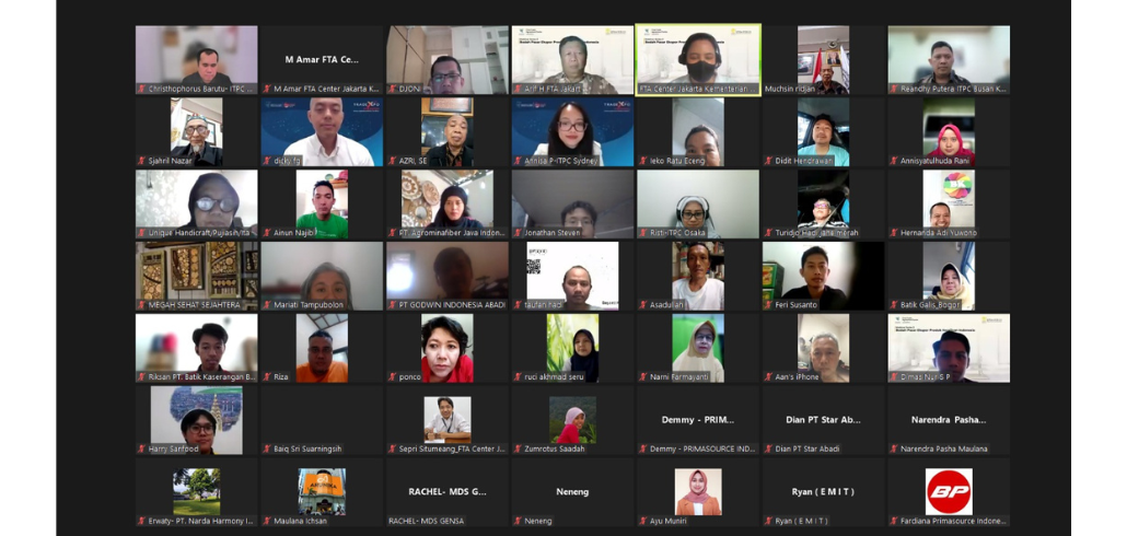 Webinar juga dibuka oleh Dr. H. Mucshin Ridjan, M.M. selaku Ketua Umum ASEPHI (Association of Exporters and Producers of Indonesian Handicraft) dan moderator kegiatan adalah Bapak Arif Hariyanto selaku Tenaga Ahli Bidang Implementasi Hasil Perjanjian Perdagangan Internasional FTA Center Jakarta.