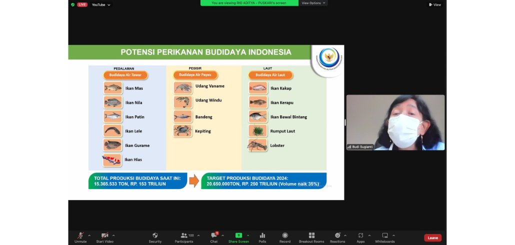 Narasumber kedua dalam webinar ini adalah Koordinator Bidang Harmonisasi dan Penindakan Pelanggaran Pusat Karantina Ikan, Badan Karantina Ikan, Pengendalian Mutu dan Keamanan Hasil Perikanan KKP, Ibu Budi Sugianti. Ibu Budi menjelaskan mengenai potensi dan kekayaan laut Indonesia, dasar regulasi produk perikanan dan karantina, tugas dan fungsi BKIPM, hingga penyelenggaraan karantina ikan, dan prosedur sertifikasi dan persyaratan ekspor ikan Indonesia.