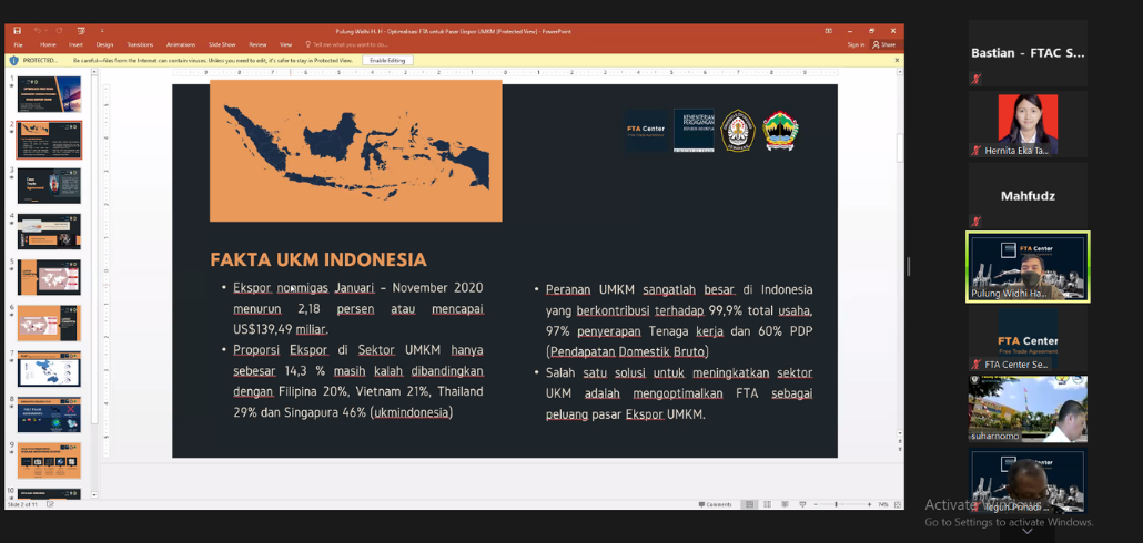 Ibu Hevearita G. Rahayu menyampaikan bahwa keberadaan FTA Center Semarang menjadi peran penting dalam membantu UMKM Kota Semarang menjadi naik kelas hingga menjadi eksportir.