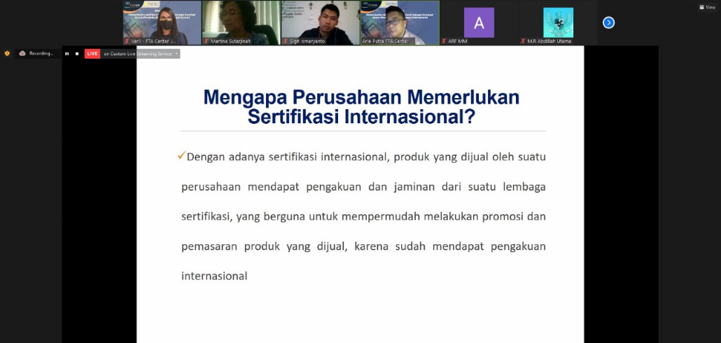 #kawaniaga pada tanggal 1 April 2021 FTA Center Jakarta melaksanakan webinar dengan tema "Pemanfaatan Sertifikasi Internasional sebagai Investasi dalam Membuka Akses ke Pasar Internasional"